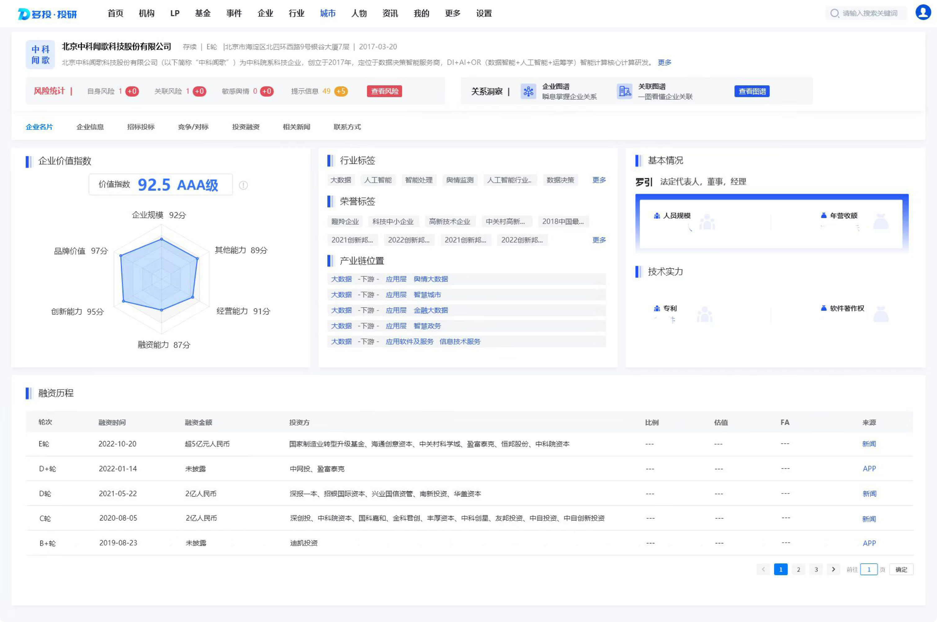 平台是北京科创基金落实市委市政府决策部署、服务国际科技创新中心建设的重要实践。平台基于图神经网络、智能风险监测模型、智能推荐引擎技术,融合产业价值图谱,为北京科创基金在投资研判、风险管理、投后赋能领域提供一站式服务,帮助客户创造AUM(资产管理规模)高质增长。